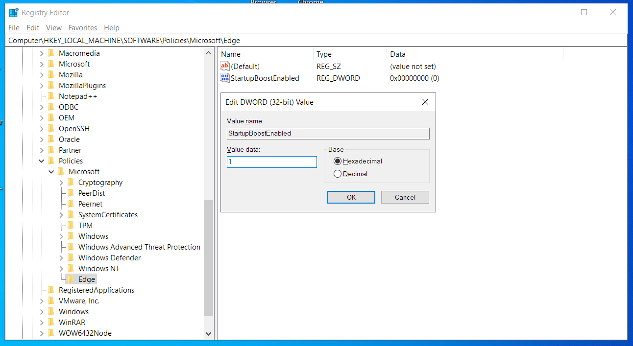 - Next, double-click StartupBoostEnabled and type “1” into the Value data box to enable Startup Boost. Type “0” instead to disable it.