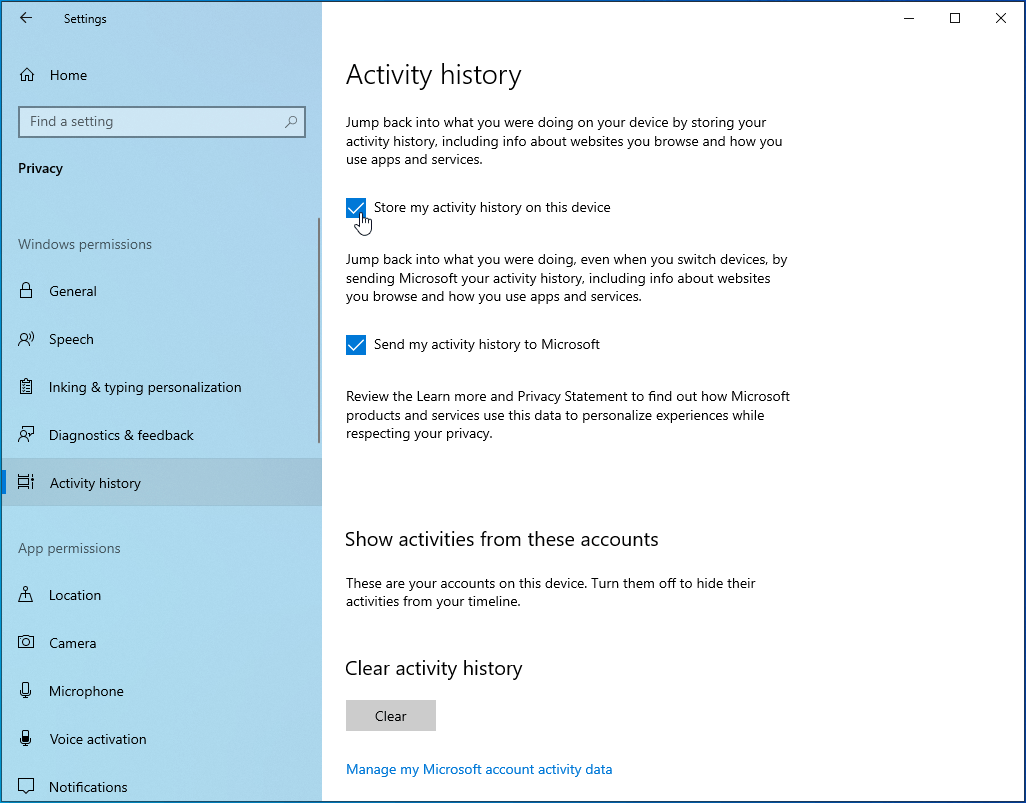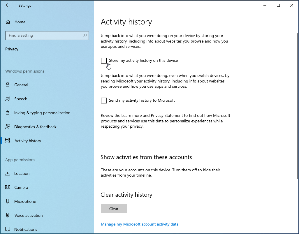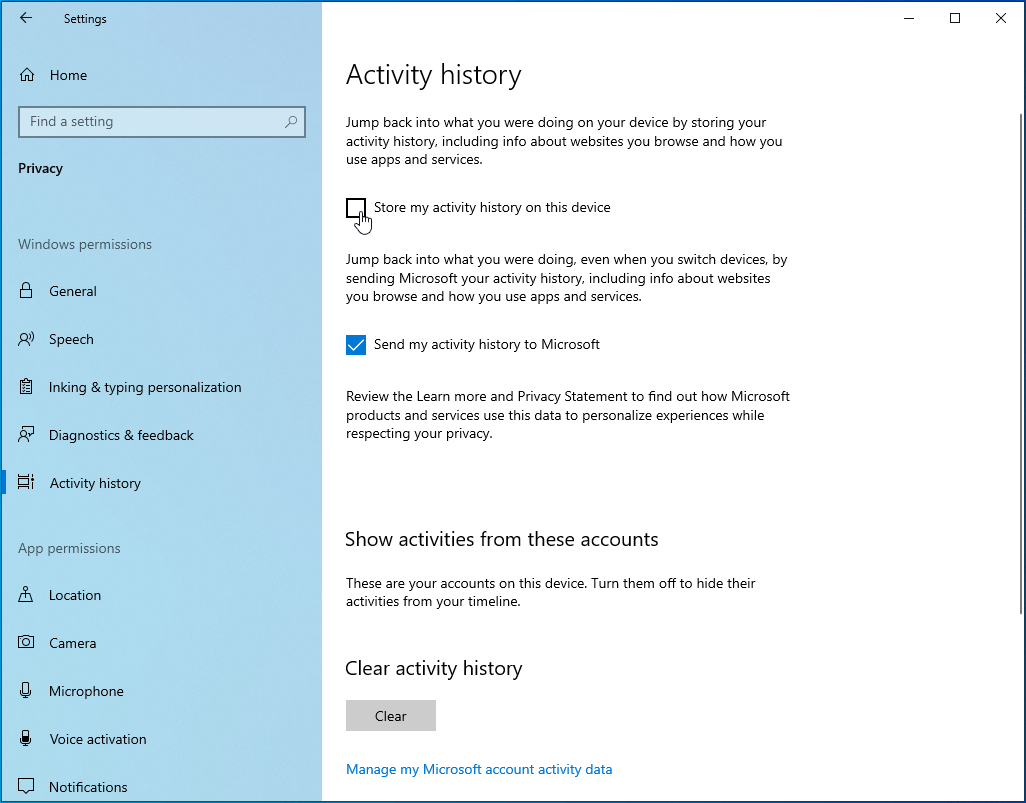 - Uncheck “Store my activity history on this device”. This action will prevent Windows from remembering activities on your device.