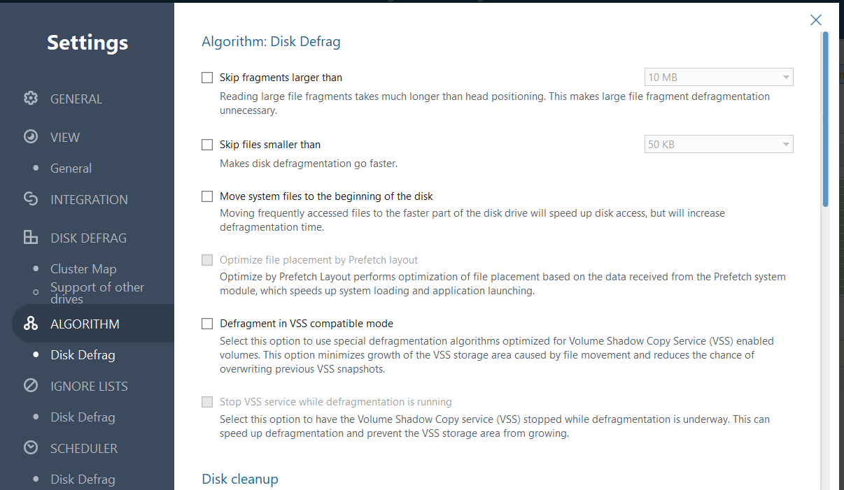 In addition, there are numerous options for defrag customization, including optimizing the placement of files on the disk after defrag. There are also broad options for file/folder exclusion and for selecting files that will be prioritized during the defragmentation process.
