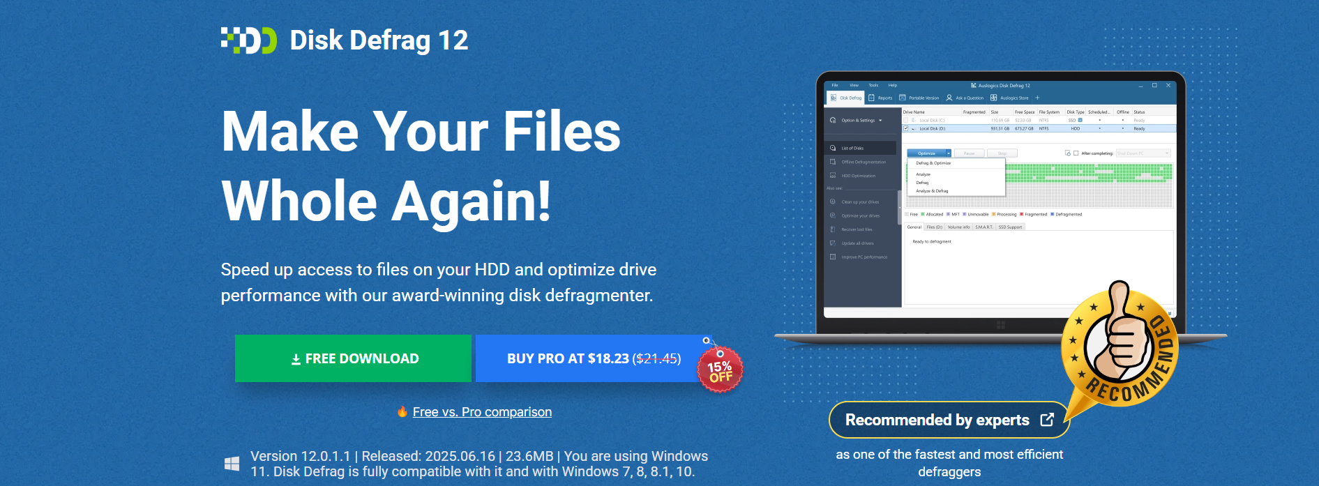 Auslogics Disk Defrag is a trusted, award-winning defrag tool with 17+ years on the market. It is one of the fastest, lightest defraggers you could ever come across.