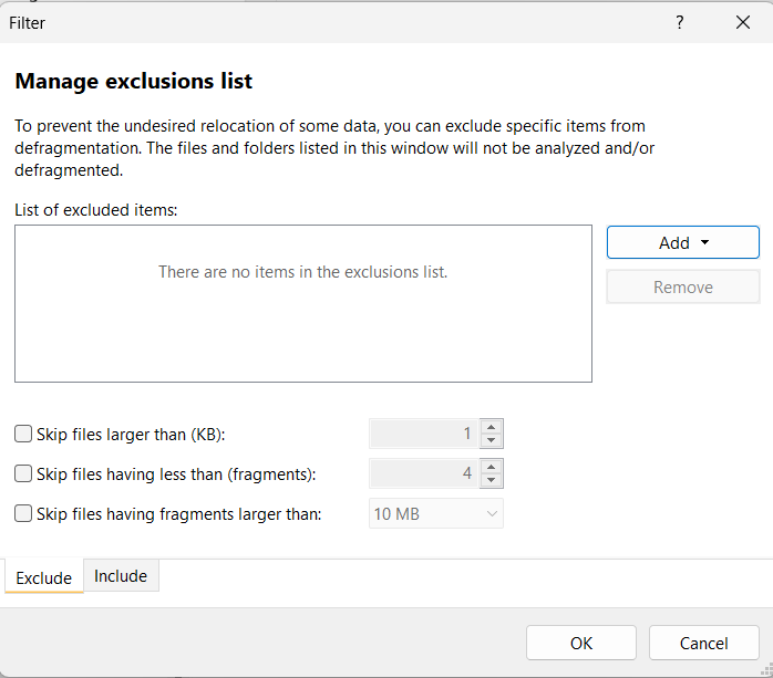 - Exclude selected files and folders from the defragmentation process. You can also exclude based on file size.