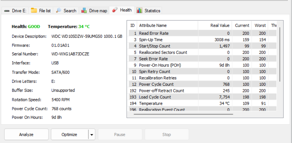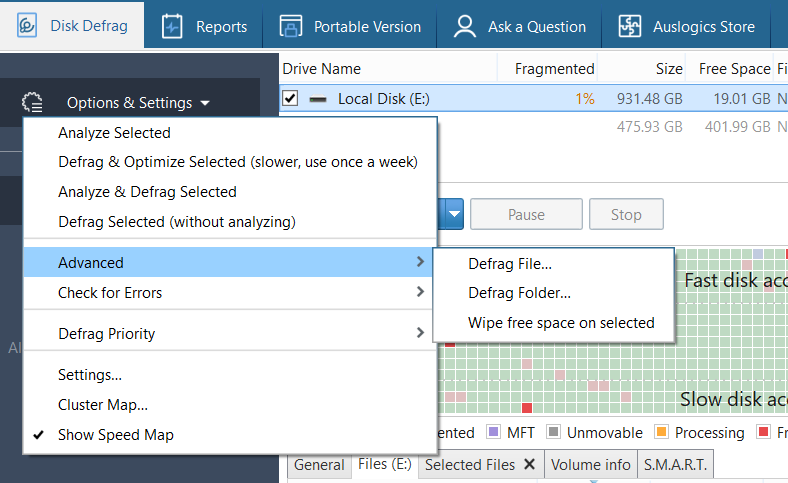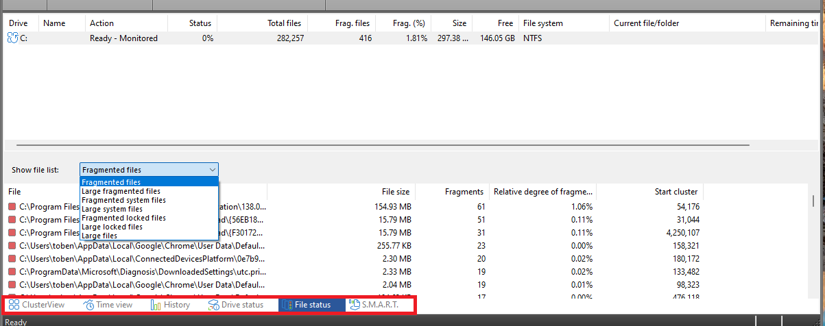 - Via the File status menu, you can get a detailed list of fragmented files on your disk. There’s also a Drive status menu and a S.M.A.R.T. menu for getting information about your drive and for monitoring the health of your drive.
