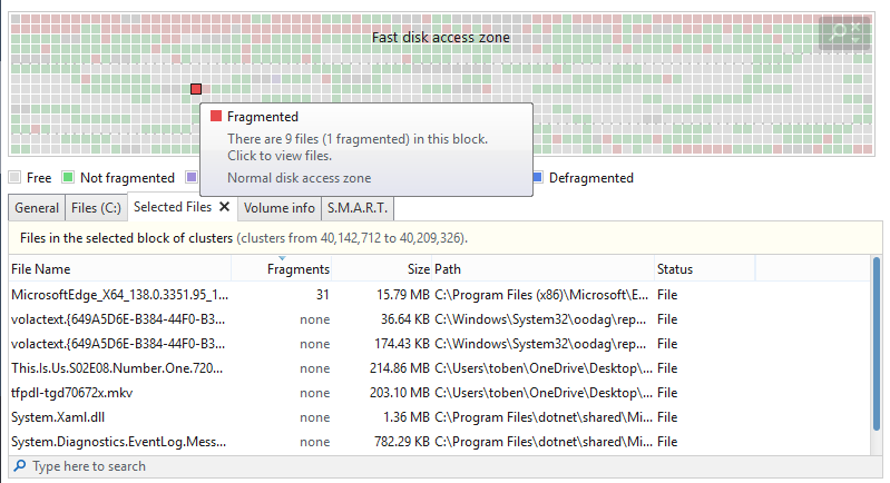 - In the classic view, clicking on a fragmented block in the cluster map gives you detailed information about fragmented files in the block.