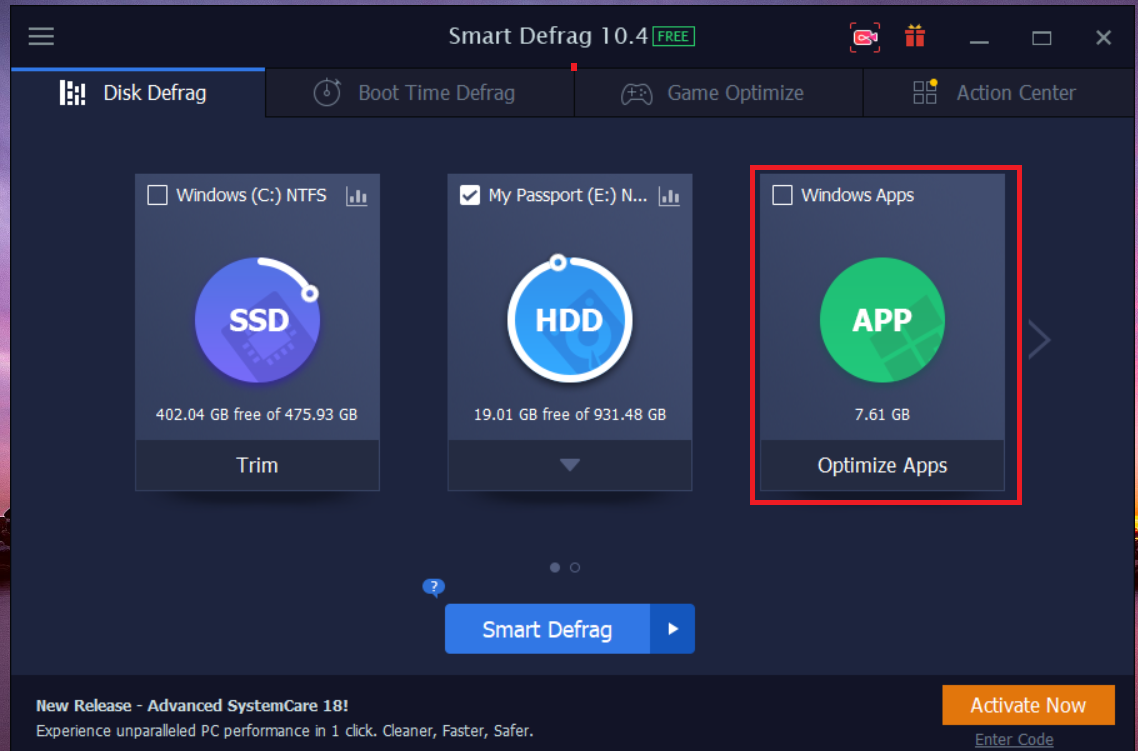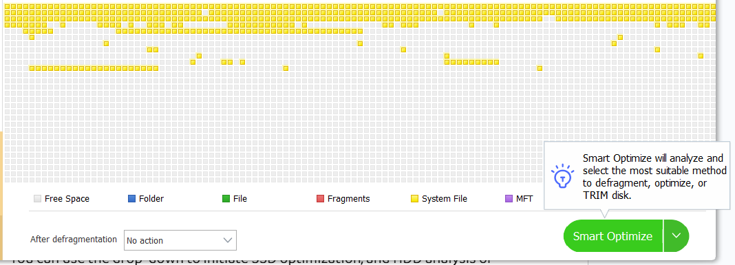 - Its Smart Optimize feature identifies the type of drive you have and runs defrag for HDDs and trimming for SSDs