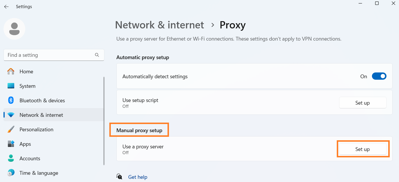 - Under Manual proxy setup, click Set up.