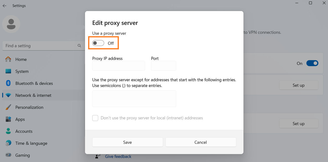 - Toggle Use a proxy server to Off.