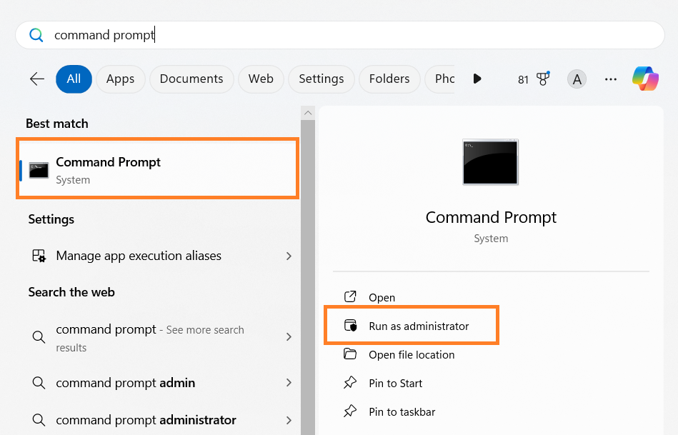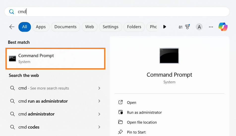 - Open the Windows search field, type cmd, and press