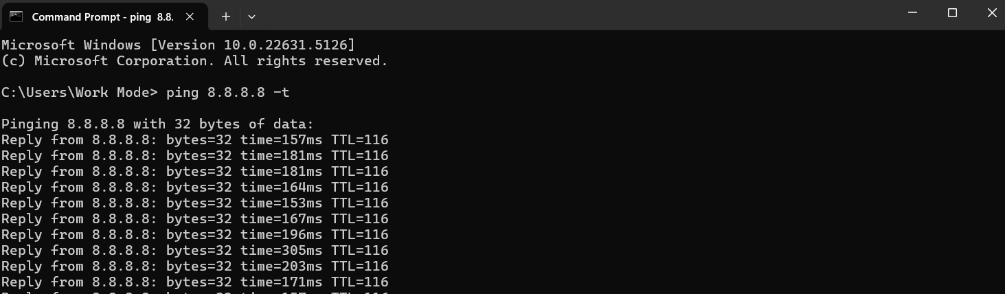 - When the Command Prompt opens, type ping 8.8.8.8 -t