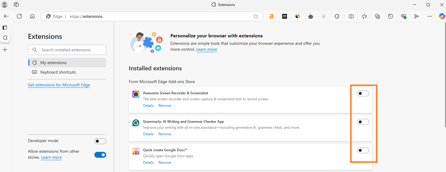 | Chrome | Same as Edge. Click the three-dot menu > Extensions > Manage Extensions. Toggle all extensions off and refresh the page. |