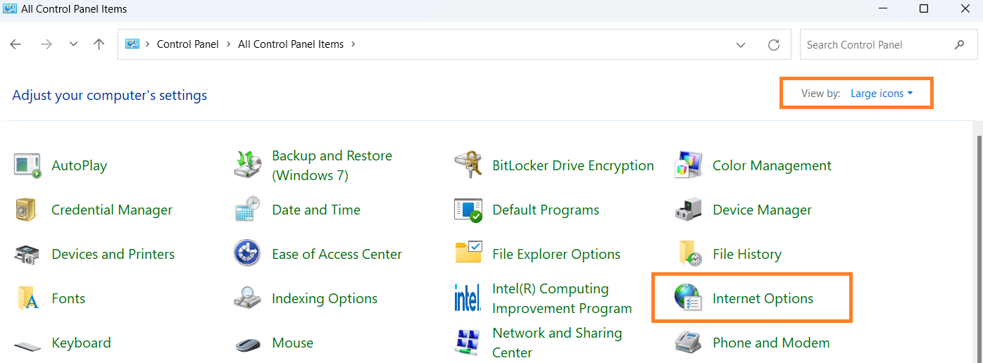 - Set the View by to Large icons and select Internet Options.