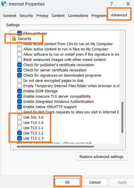 - Uncheck SSL 2.0 and SSL 3.0 because they are outdated and insecure.