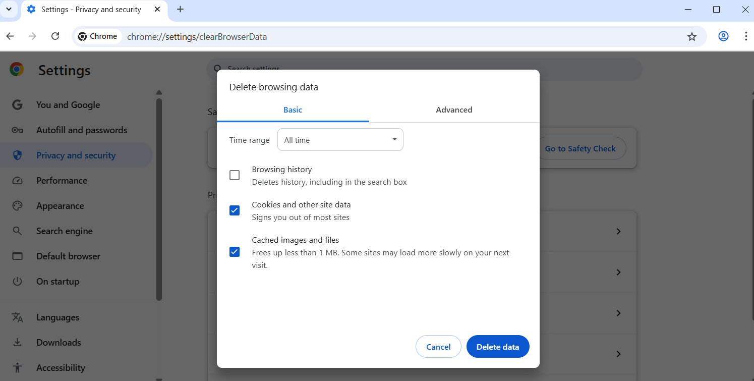 - Browser cache and cookies causing conflicts: Old or broken data in your browser might confuse how it loads websites and trigger a reset. Clear your browser’s cache, cookies, and saved data.