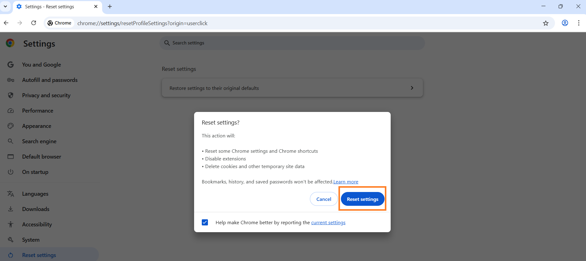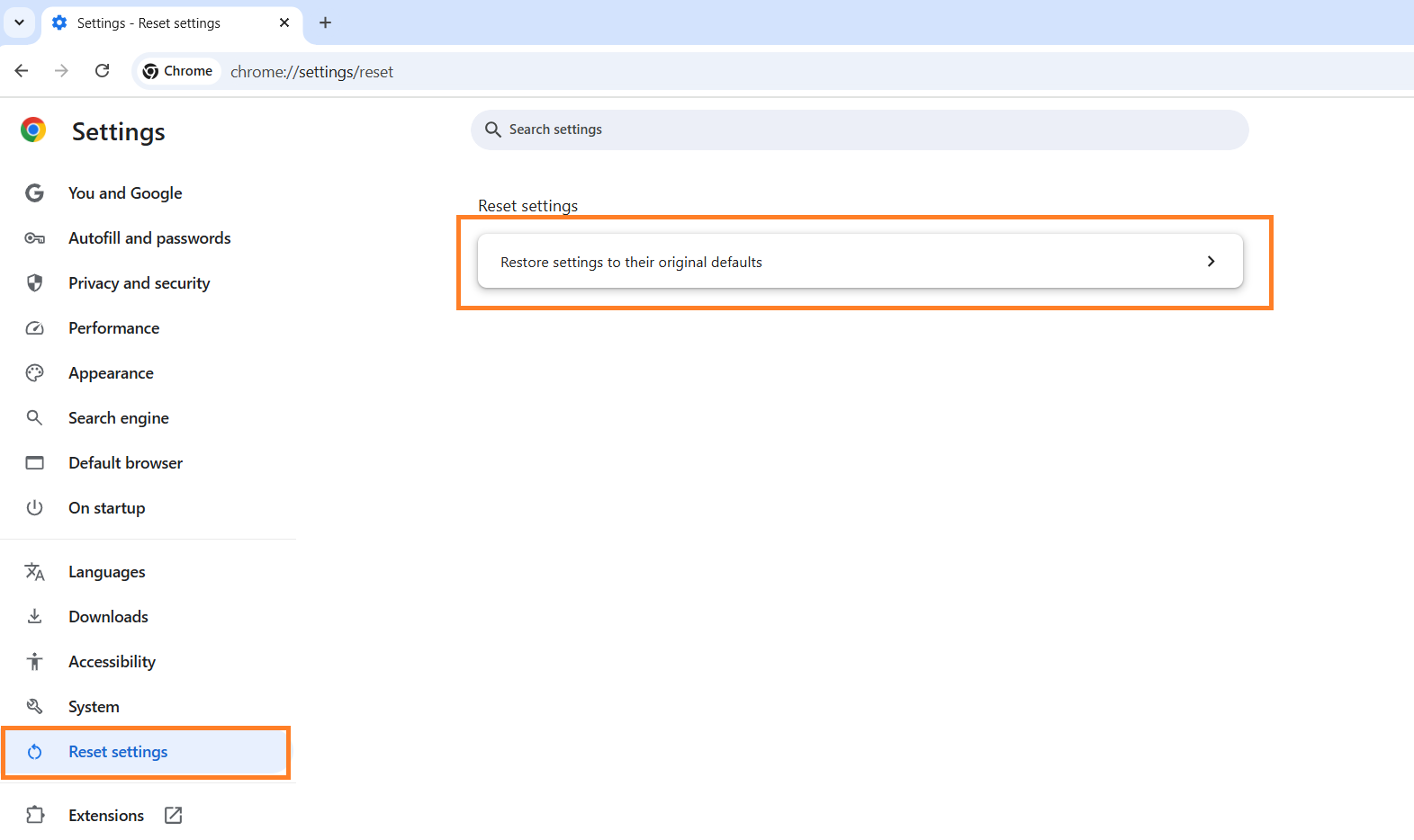 - Scroll down, click Reset settings, and select Restore settings to their original defaults.