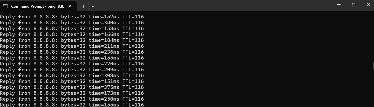 - Let it run for 10–15 seconds. You should see something like this: Reply from 8.8.8.8: bytes=32 time=157ms TTL=116