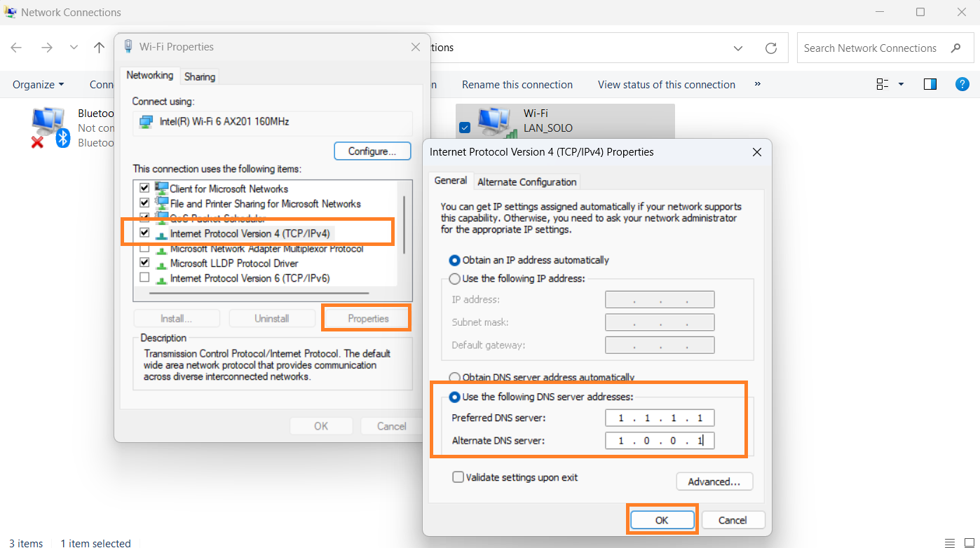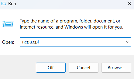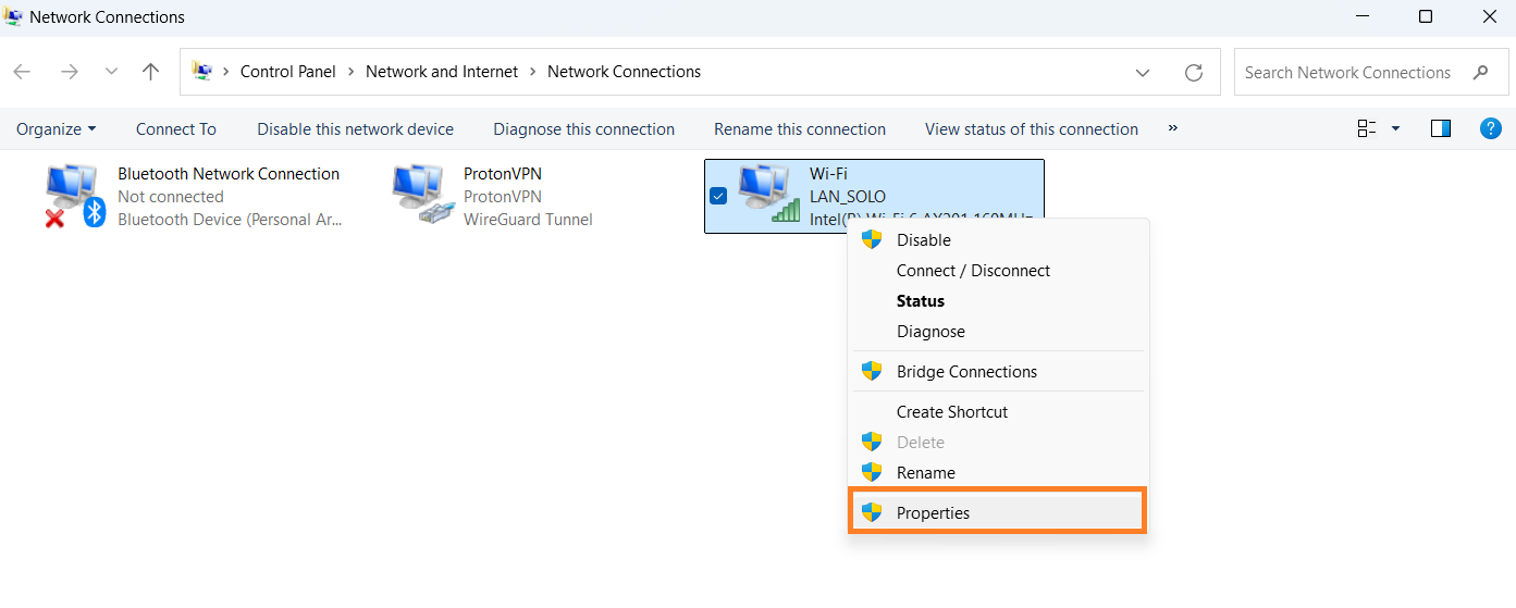 Windows + R, type ncpa.cpl, and pressEnter. - Right-click your active internet connection and select Properties.