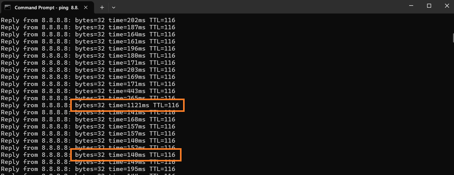 - Variations in the latency: The response times range from 140 ms to 1,121 ms, which indicates high fluctuations. This suggests occasional spikes in latency, which may indicate an unstable connection.