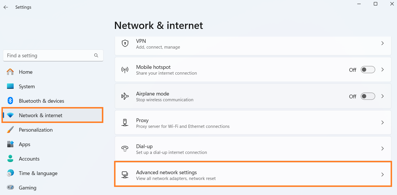 Windows + I) and select Network & internet. - Scroll down to Advanced network settings.