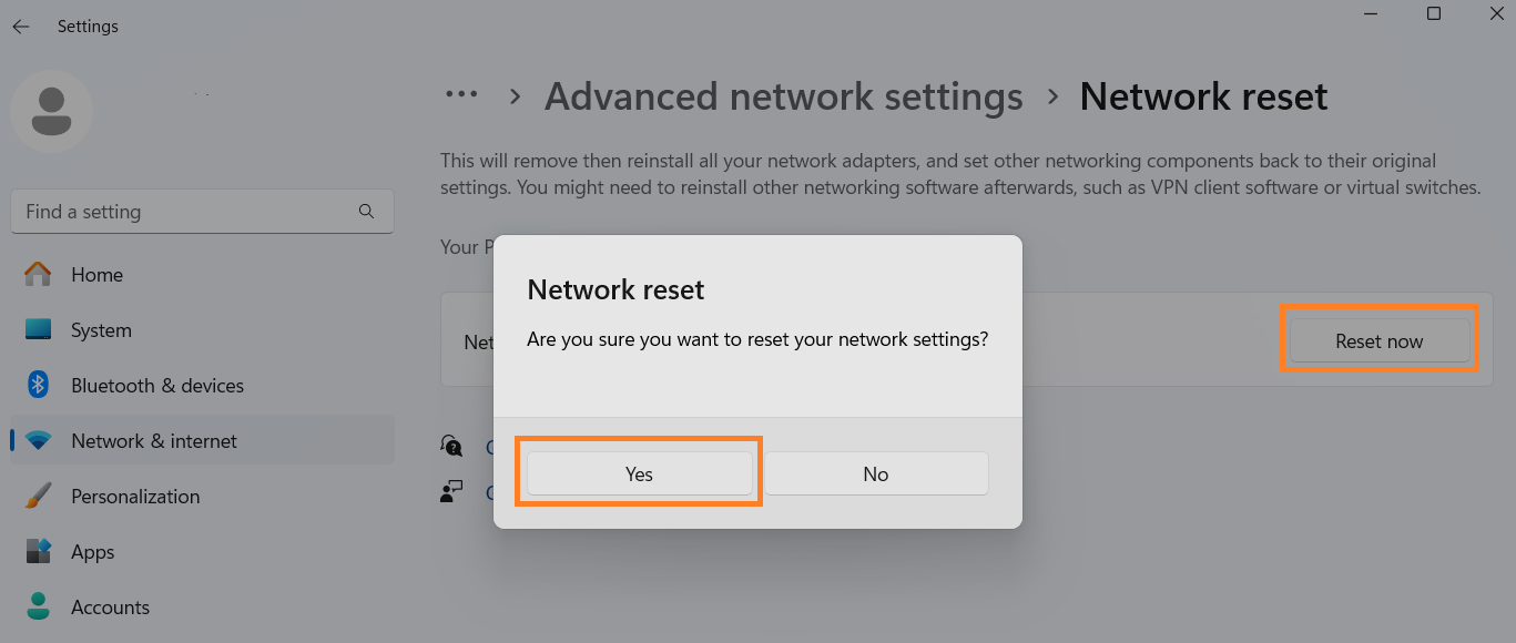 This will remove all your Wi-Fi passwords and network adapters. Be ready to reconnect to your Wi-Fi afterward.