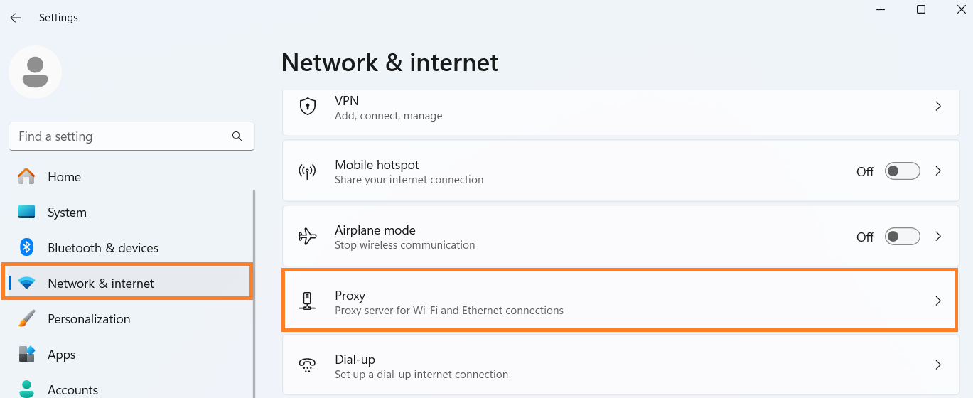 - Open Settings, go to Network & internet, and select Proxy.