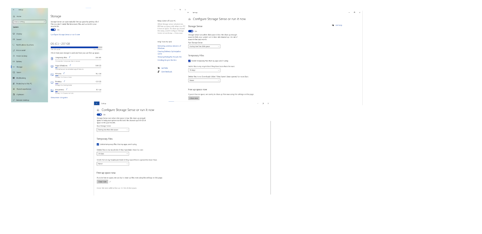 Click Free up space now if you want to run a Windows 10 disk space cleanup immediately.
