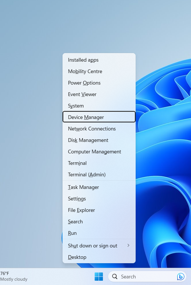 - Right-click Start and select Device Manager.