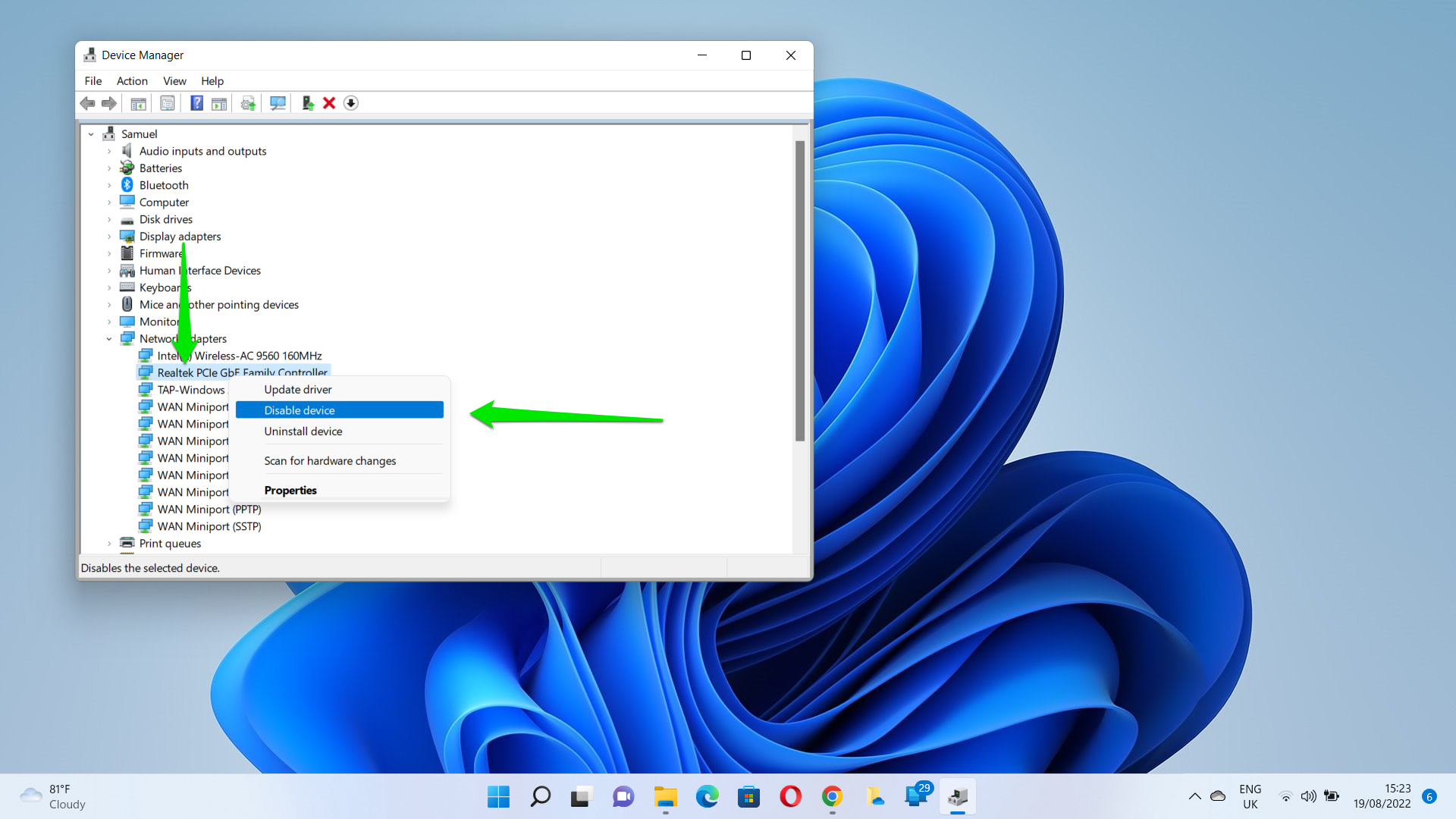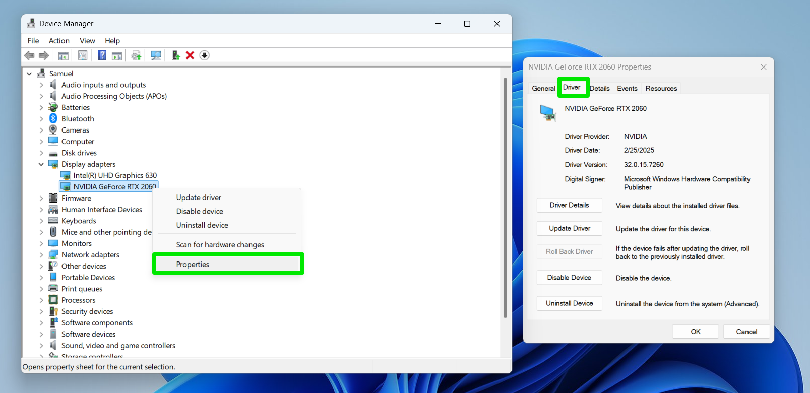 - Right-click the device and select Properties.