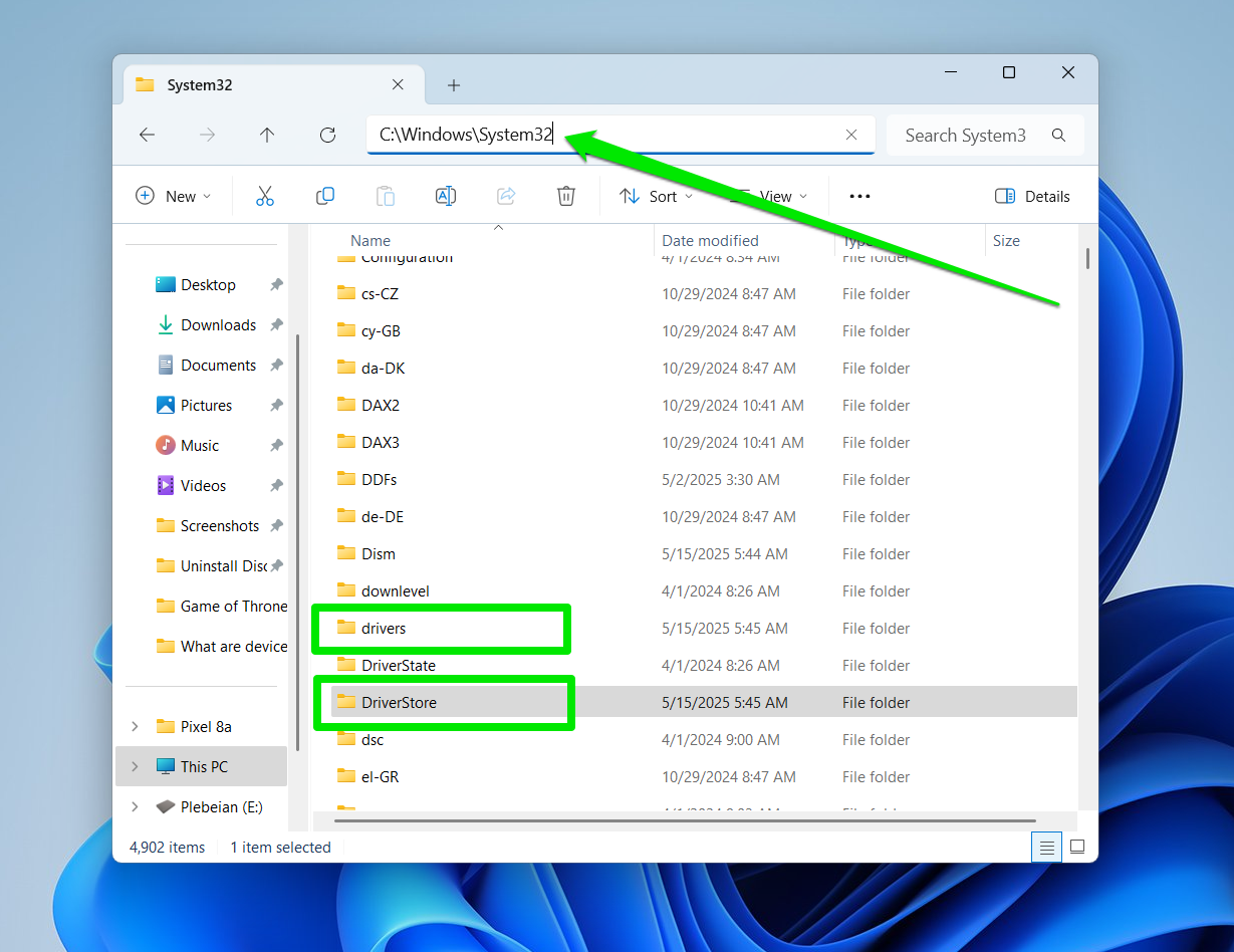 Most device drivers are stored in the C:\Windows\System32\Drivers or C:\Windows\System32\DriverStore folder. They are mostly saved in these folders with the .sys file extension and are called dynamic link library files.