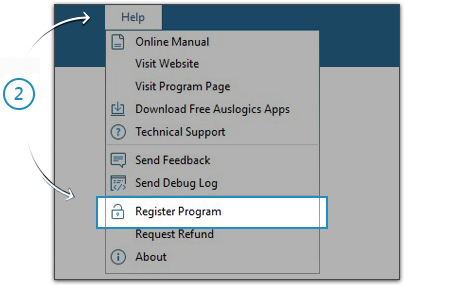 Inicie Disk Defrag, haga clic en Ayuda en la parte superior de la ventana principal del programa y seleccione Registrar programa en el menú desplegable (fig. 2).