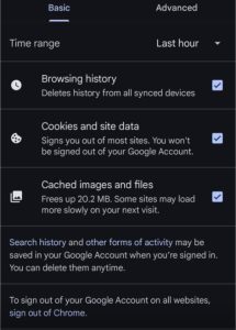 Certifique-se de que as opções “Histórico de navegação”, “Imagens e arquivos em cache” e “Cookies e outros dados de sites” (caso queira removê-los) estejam selecionadas.