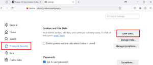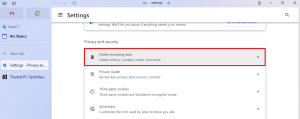 - Quando a janela de Configurações abrir, clique em “Privacidade e Segurança” e selecione “Limpar dados” na seção “Cookies e dados de sites”.