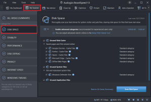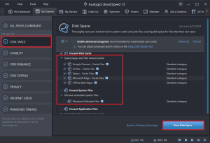 - Você verá os arquivos de cache do navegador na seção “Unused Web Cache”. Você pode desmarcar todas as opções dessa categoria, exceto aquelas que deseja excluir, antes de clicar em “Scan Disk Space”.