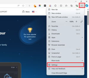 No navegador Edge, vá até o canto superior direito, clique nos três pontos horizontais e selecione “Configurações”.