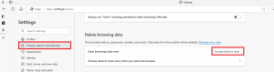 - Quando a janela abrir, clique em “Privacidade, pesquisa e serviços” e role até “Excluir dados de navegação”. Em seguida, clique em “Escolher o que limpar”.