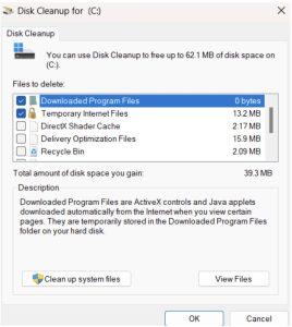 - Selecione os arquivos temporários e outros arquivos que deseja excluir e clique em OK.